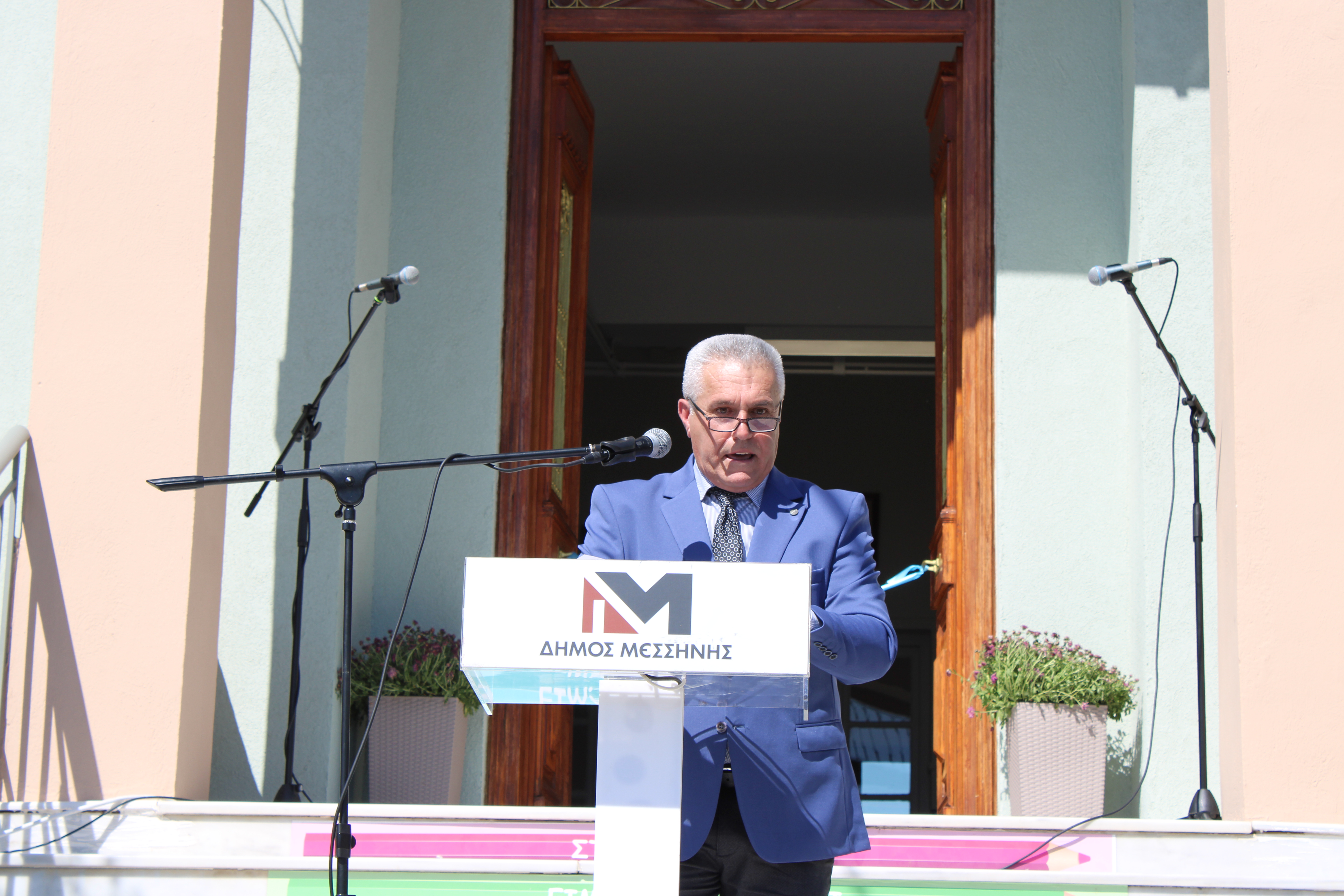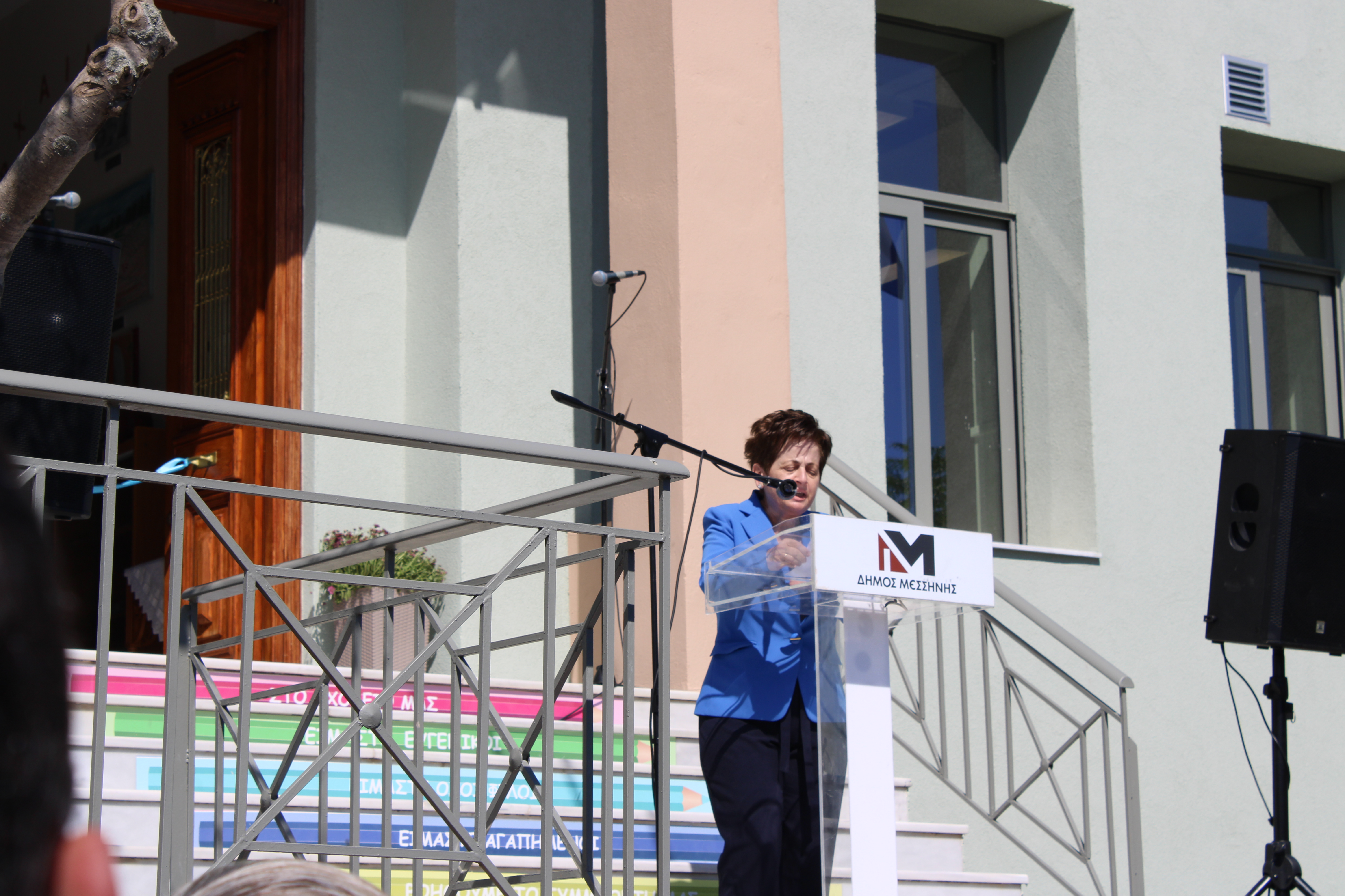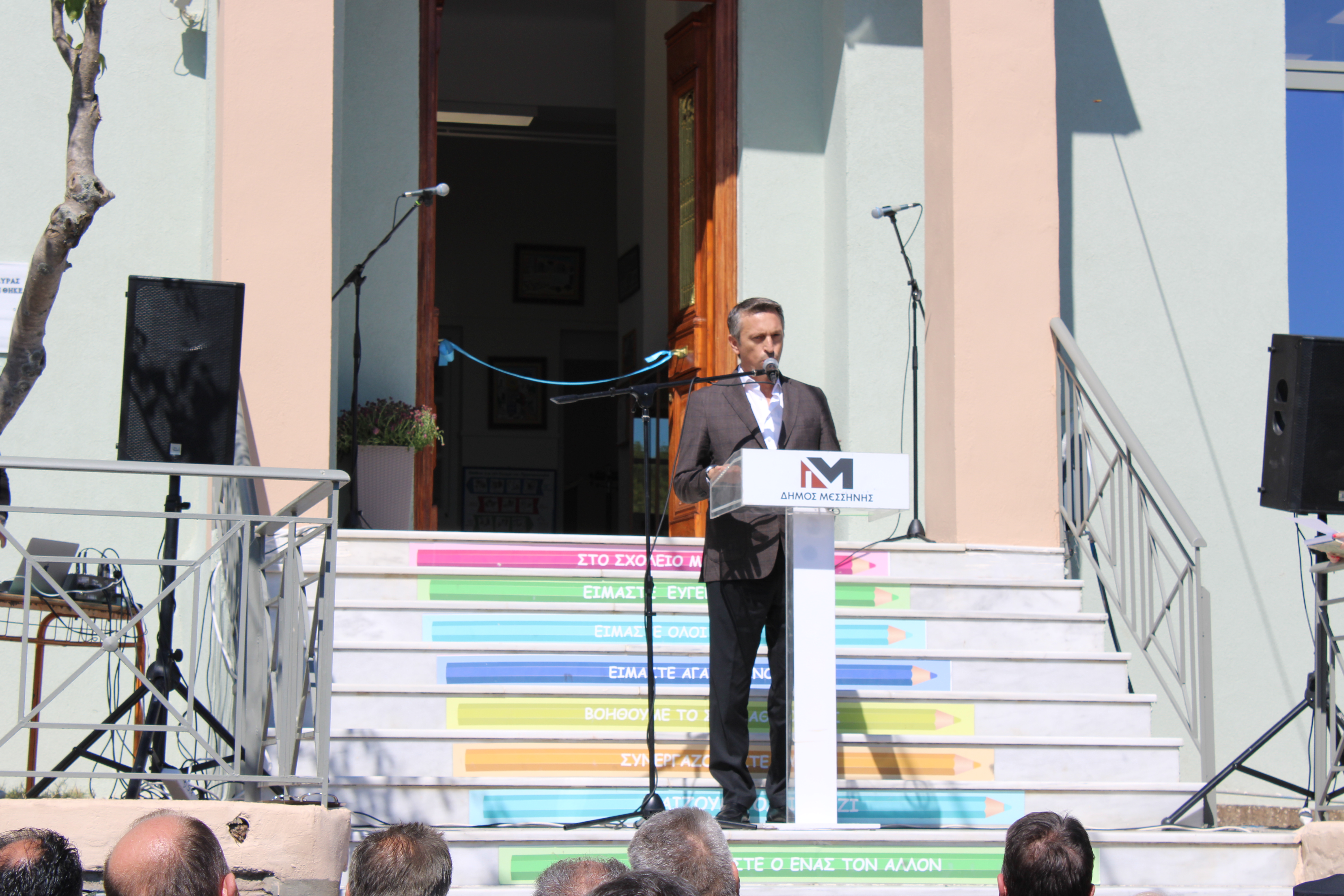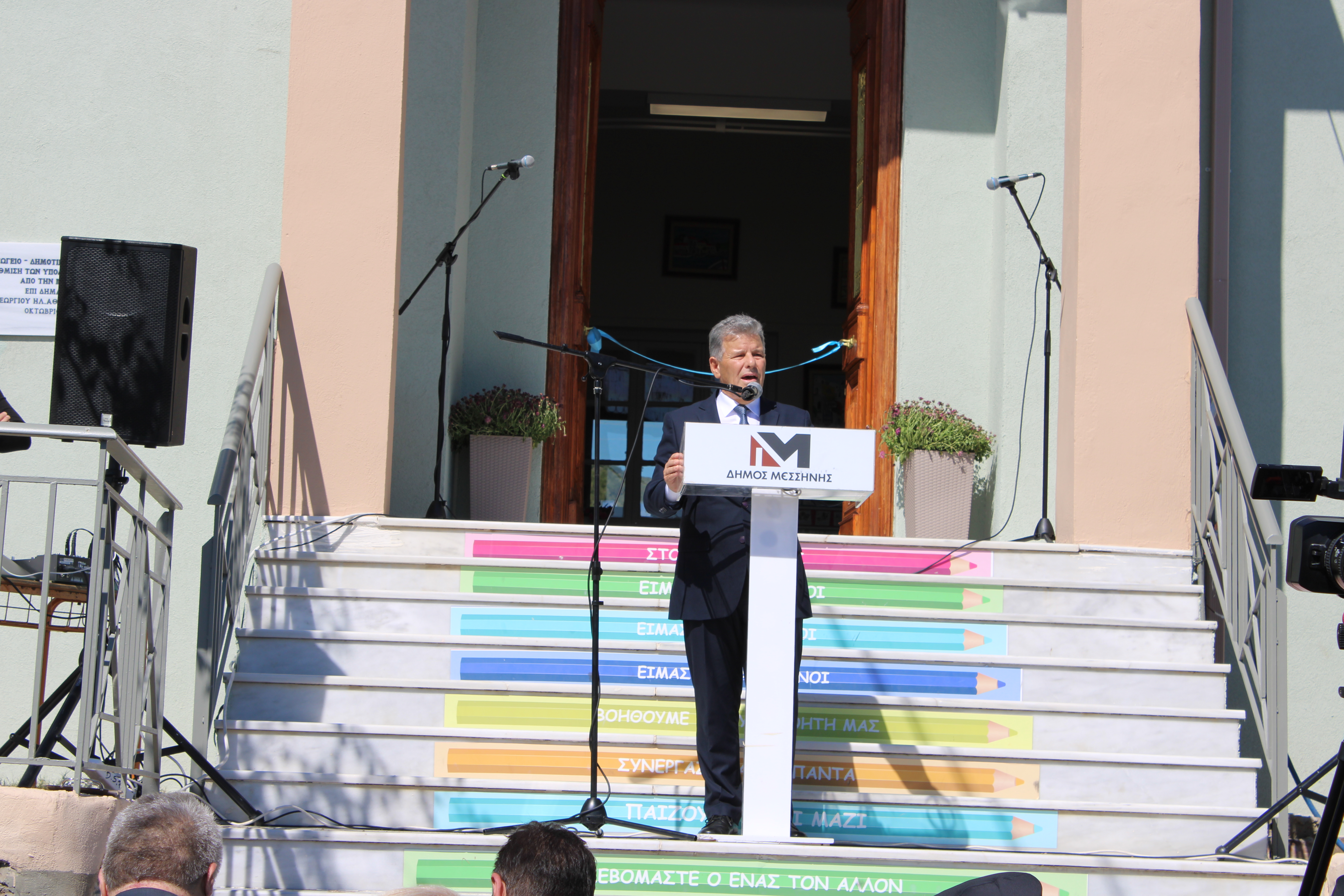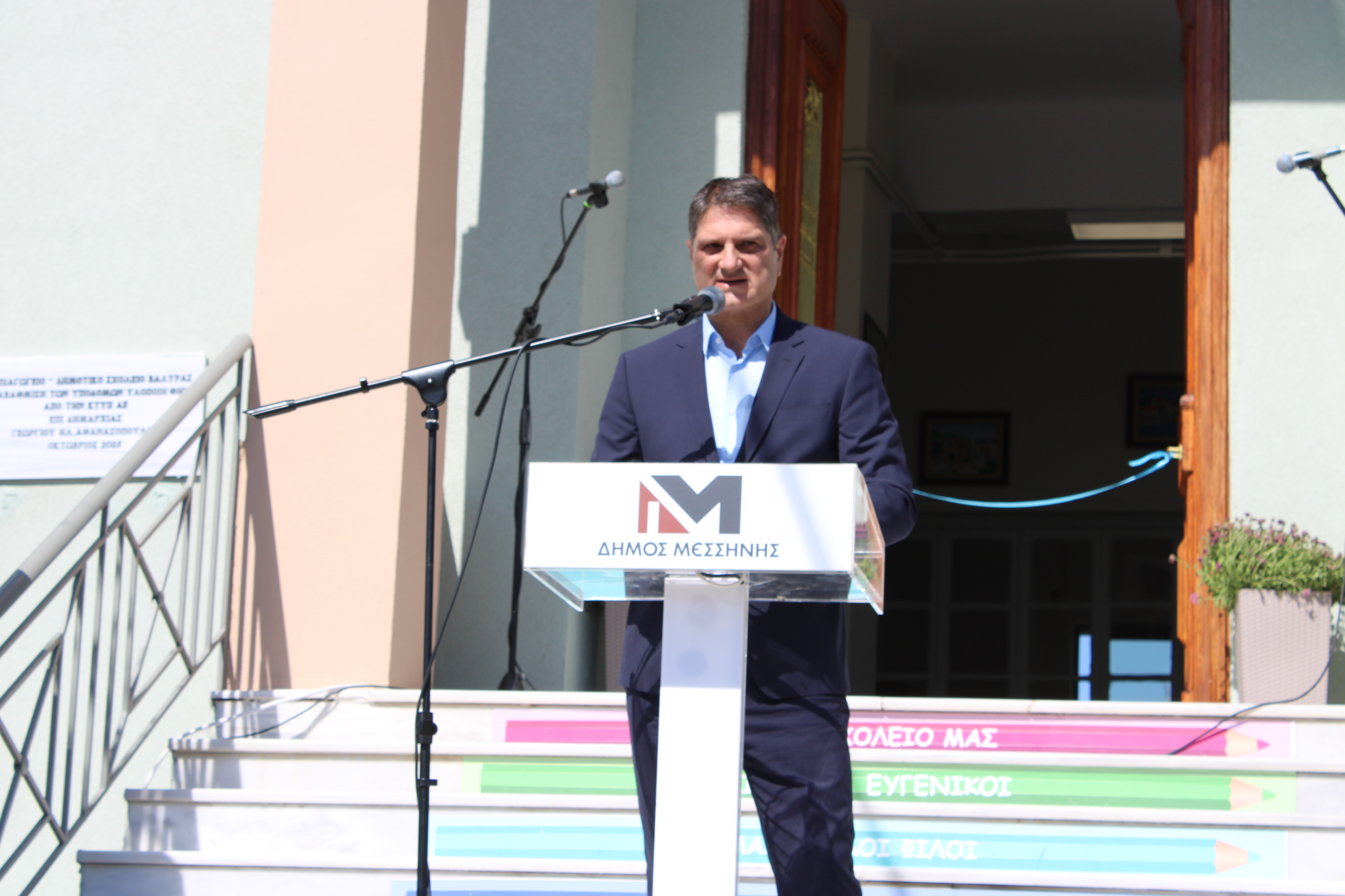 Ο Δήμαρχος Μεσσήνης Γιώργος Αθανασόπουλος στον χαιρετισμό του εξέφρασε την μεγάλη του χαρά για την ολοκλήρωση αυτού του έργου ενάμιση μήνα πριν την συμβατική του υποχρέωση και την παράδοσή του σε μαθητές και εκπαιδευτικούς για την έναρξη της νέας σχολικής χρονιάς. Τόνισε ότι η ποιοτική εκπαίδευση είναι ότι καλύτερο μπορούμε να προσφέρουμε στα παιδιά για την πρόοδό τους και η βάση για να προχωρήσει μία κοινωνία μπροστά. Σημείωσε ότι στρατηγικός στόχος της Δημοτικής Αρχής είναι να συνδράμει στην προσπάθεια αναστροφής του κλίματος της πληθυσμιακής συρρίκνωσης προσφέροντας έργα και υποδομές στους νέους. Κατόπιν αναφέρθηκε στο χρονοδιάγραμμα εκπόνησης των μελετών από τον Δήμο, στην άμεση ανταπόκριση του προέδρου της ΚΤΥΠ ΑΕ κ. Κατσίπου και του διευθύνοντος συμβούλου της κ. Γιάνναρη για την πραγματοποίηση του έργου, και την αναβάθμιση του σχολείου από την ΚΤΥΠ ΑΕ σε κτίριο με μηδενικό ανθρακικό αποτύπωμα και σχεδόν μηδενική ενεργειακή κατανάλωση. Πρόσθεσε ότι ταυτόχρονα ο Δήμος με ιδίους πόρους ανακατασκεύασε τον περιβάλλοντα χώρο, διαμορφώνοντας γήπεδο μπάσκετ, κιόσκι σκίασης και αναμονής και το πάρκινγκ εξωτερικά του σχολείου και ευχαρίστησε όσους συνεργάστηκαν για την επίτευξη του έργου τονίζοντας ότι η Δημοτική Αρχή θα είναι πάντα δίπλα στους νέους με έργα και όχι με λόγια.