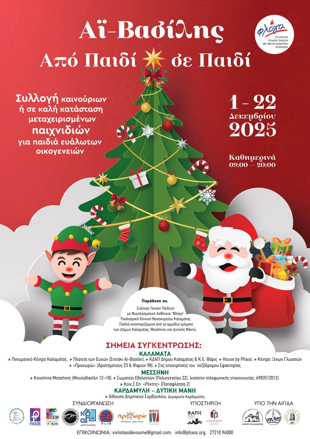 Για 5η χρονιά φέτος συνεχίζεται η χριστουγεννιάτικη δράση αγάπης και αλληλεγγύης «Αϊ-Βασίλης Από Παιδί σε Παιδί», η οποία έχει ως στόχο τη συλλογή παιχνιδιών για παιδιά ευάλωτων οικογενειών ηλικίας 1–16 ετών. Με τη συνεργασία φορέων και επιχειρήσεων της Μεσσηνίας, η φετινή ενιαία δράση συνεχίζει την πορεία προσφοράς και αλληλεγγύης, ώστε όλοι, μικροί και μεγάλοι, να έχουν την ευκαιρία να προσφέρουν χαμόγελα τις γιορτινές ημέρες.Τα παιχνίδια, καινούρια ή μεταχειρισμένα σε πολύ καλή κατάσταση, θα παραδοθούν στα παιδιά που φιλοξενούνται στη δομή του Συλλόγου Γονιών Παιδιών με Νεοπλασματική Ασθένεια «Φλόγα», στους μικρούς ασθενείς της Παιδιατρικής Κλινικής του Νοσοκομείου Καλαμάτας, καθώς και σε παιδιά που υποστηρίζονται από τη Διεύθυνση Πρόνοιας του Δήμου Καλαμάτας, το Τμήμα Κοινωνικής Πολιτικής του Δήμου Μεσσήνης και του Δήμου Δυτικής Μάνης.
